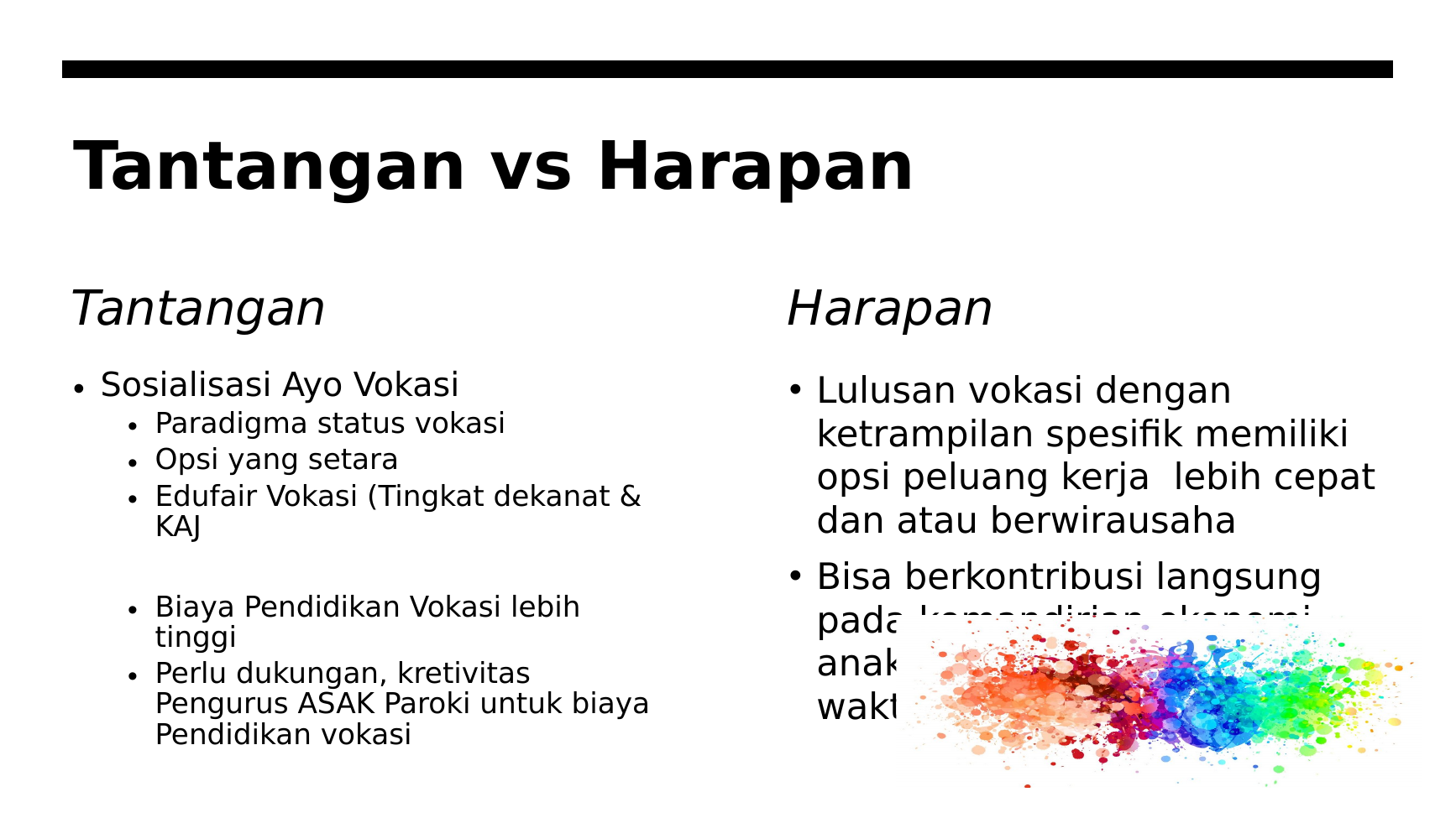 - Tantangan: paradigma sosial yang masih memandang vokasi sebagai “opsi kedua”; perlunya Edufair Vokasi tingkat dekanat & KAJ; biaya pendidikan vokasi yang relatif tinggi; perlu kreativitas pengurus paroki untuk menutup biaya.